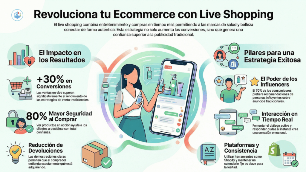 Según un estudio de Shopify, las ventas en vivo aumentan las conversiones hasta un 30% frente a estrategias tradicionales. Pero, ¿cómo puedes implementar esta estrategia en tu ecommerce de salud, belleza y bienestar?